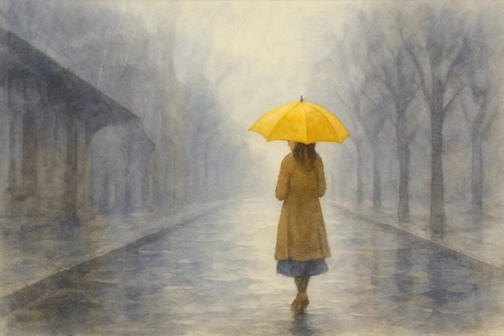 Caminhava com passos calmos, como se a pressa não tivesse lugar ali. Vestia um casaco bege, e segurava um guarda-chuva amarelo que, mesmo discreto, parecia iluminar a calçada cinza. Ao ver Gabriel parado ali, hesitante, ela parou também.