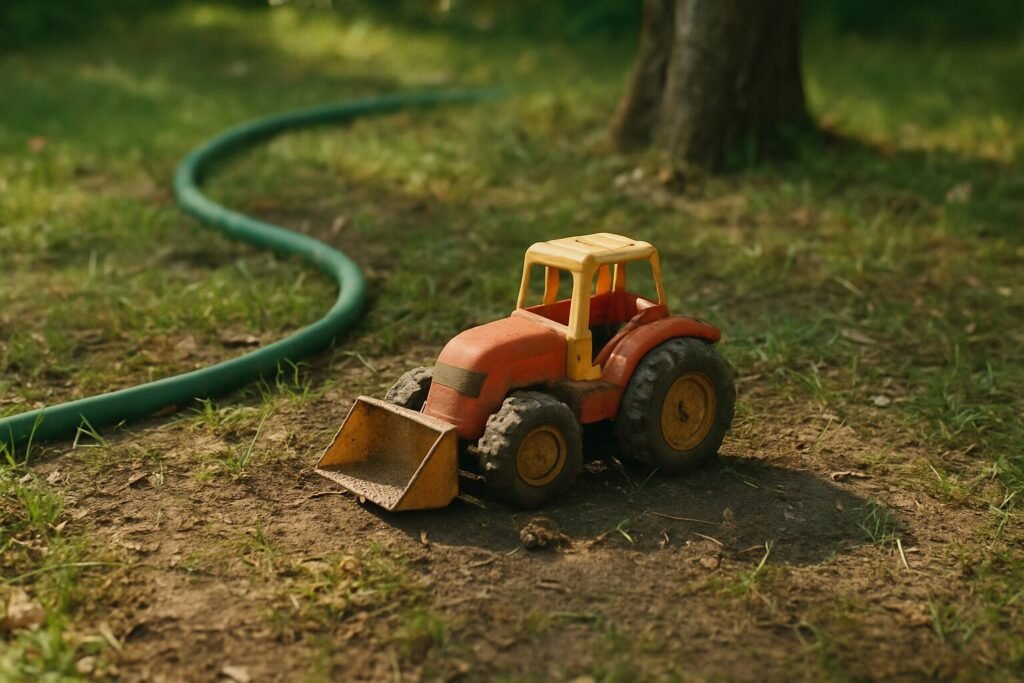 Tiago se agachou. Pegou o brinquedo com cuidado, como se fosse frágil demais para o presente. Lembrou das tardes em que passava ali, cavando buracos imaginários, levando pedras de um lado pro outro com aquele mesmo trator. Lembrou do primo Lucas, das brigas por causa dos carrinhos, dos dois se sujando até os cabelos. Lembrou da avó gritando: “Vai lavar a mão antes de entrar!”